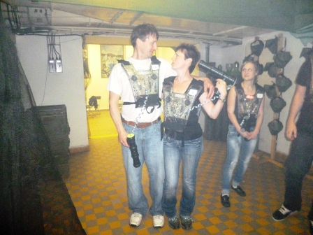 Vítá nás veselý chlopek a vyzývá k odložení nadbytečných svršků. Poté nás svolává na "nástup". Seznámil nás stručně s principem hry (ten nebyl nikterak složitý, když víte, že máte v ruce zbraň :-D), upozornil nás na zdravotní rizika...zejména srážky s jiným zapáleným bojovníkem při rychlém přesunu a pak nás provedl bojovým prostorem. Už tato krátká exkurze mi neudělala příliš dobře. Všude jakési hranaté překážky zahalené černou látkou, schůdky, průchody a zákoutí. Šero až tma. Když jsem za sebou uslyším hlasité syčení a za mnou se rozběhne hustý černý dým, mám sto chutí se na celou slavnou lasergame vykašlat. Zřejmě projev nějaké fóbie. O svém strachu šeptám do ucha jen tátovi, ale vzhledem k tomu, že si volíme boj muži versus ženy, jsem jeho soupeřem a on mou fóbii v boji absolutně nezohledňuje. V této chvíli ale stojíme před "zbrojním skladem". Dostáváme přiděleny umělohmotné vesty plné blikajících žároviček. K vestě je dole kabelem připevněna zbraň. Už není úniku. Chlopek nás "zprovozňuje" nějakým ovladačem. Ve chvíli zprovoznění začíná na vestě svítit číselný dispey a začíná hrát dramatická hudba. Ta umocňuje atmosféru. V prvních minutách skoro výhradně stojím v různých koutech a nesměle vystrkuju nos. Abych vykázala alespoň nějakou bojovou činnost, zmáčknu občas spoušť a vyšlu paprsek buď na zbloudilé bojovníky nebo do prostoru, kde jen cítím podezřelý pohyb. Kdyby byly rány ostré, asi bych si zdecimovala vlastní řady spolubojovnic, neboť rozlišit v tom fofru, zda pálím na cizího či svého, ukázalo se jako velmi nesnadný úkol. Po pár minutách se přece jen odvážím udělat několik kroků do bojiště. Důsledně si hlídám prostor před i za sebou, přesto schytávám zásahy a prožiju si svou první "válečnou"smrt (naštěstí jen pětivteřinovou)¨. Ani to nebolelo, takže získávám odvahu ke smělejším záškodnickým výpravám do nepřátelského území. Když sama "paralyzuji" několik protivníků, dodávám si odvahy. Přebíhám už nejen od překážky k překážce, ale probíhám i místnostmi a číhám...Hlas z repráku nám ohlašuje konec hry a my se scházíme u chlopka. Ten načítá příslušným přístrojem data z našich vest, aby záhy vše zapsal a my mohli porovnat, jakou bojovou aktivitu kdo vykonal. V této hře jsem si vedla dobře. Mých 8 "úmrtí" ukázalo se jako velmi dobrý výsledek. Povzbuzena tímto úspěchem, vrhám se do druhé hry s poněkud větší odvahou. Snažím se už nejen skrývat, nýbrž i aktivně vyhledávat protivníka. To se mi sice daří, ale odvahu zaplatím čtyřmi úmrtími navíc. Poslední hru jsem už hotový bojovník-profík. :-D. Ukrývám se, přebíhám, číhám, plížím se po linoleu (v této chvíli mě napadá, co by tomu řekli mí žáci, kdyby mě tu takhle viděli...), útočím, vysílám i pohlcuji paprsky zbraní a hlavně...bavím se :-D.
